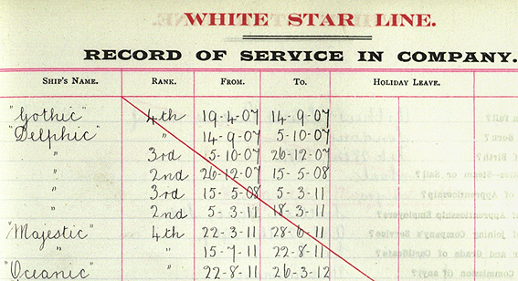Pitman's White Star Line record detailing the ships he worked on prior to the Titanic.