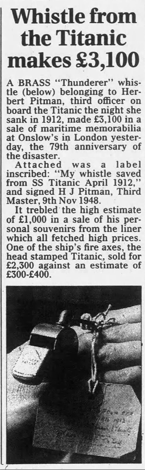 According to The Daily Telegraph of 16 April 1991 Pitman wrote a note on his "Thunderer" whistle "My whistle saved from SS Titanic April 1912" and signed H J Pitman, Third Master, 9th Nov 1948. It was later sold at auction in April 1991 for £3,100.