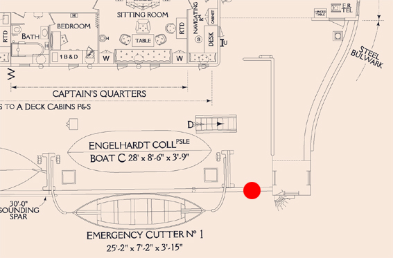 The precise position the rockets were fired from on the starboard boat deck, marked with a red circle (Deck plans: Honor & Glory)